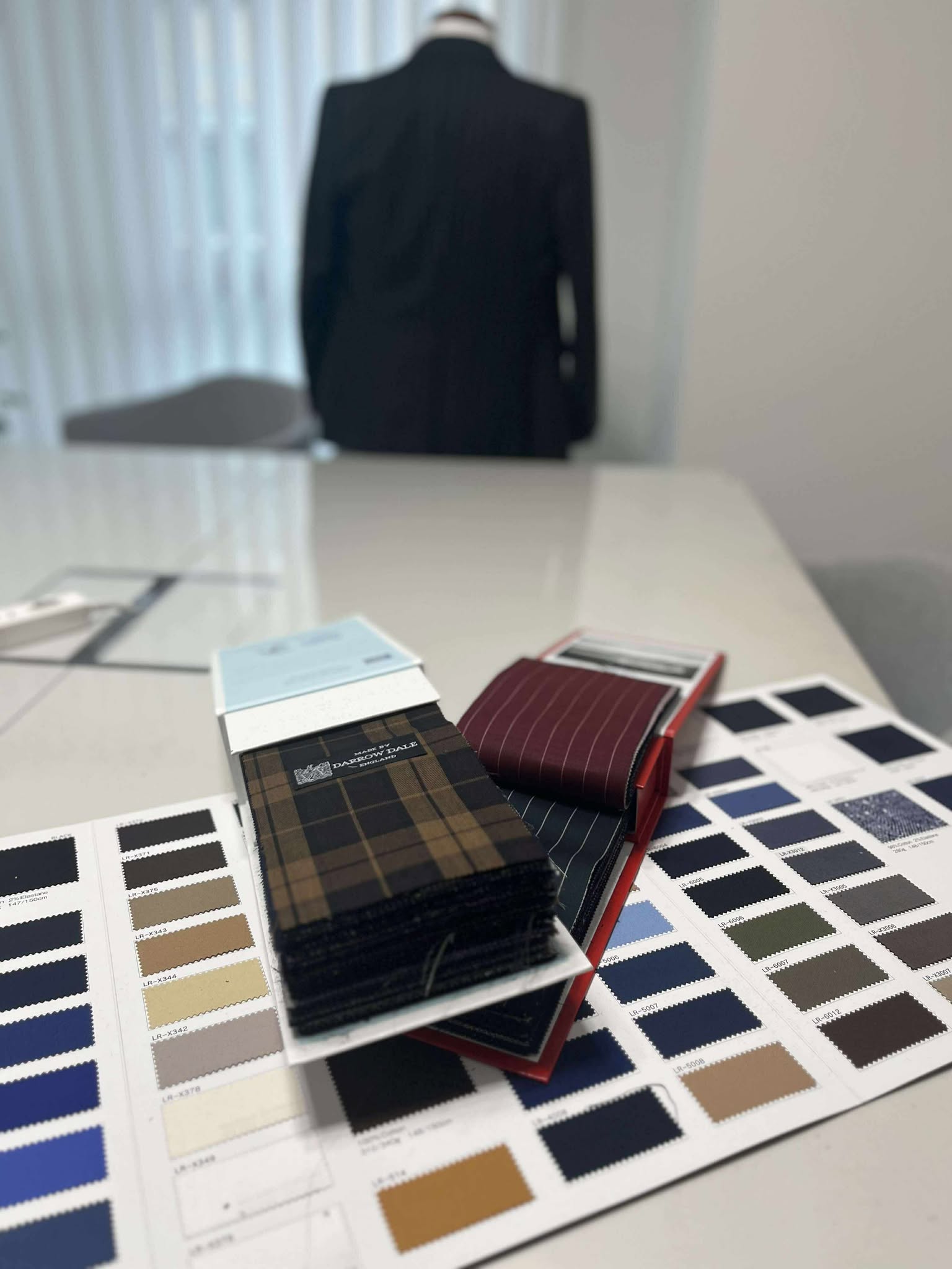 DRESS CODEでは、お客様一人ひとりの骨格や体型に合わせた採寸を行い、1,500種類以上の生地から最適な一枚を提案。