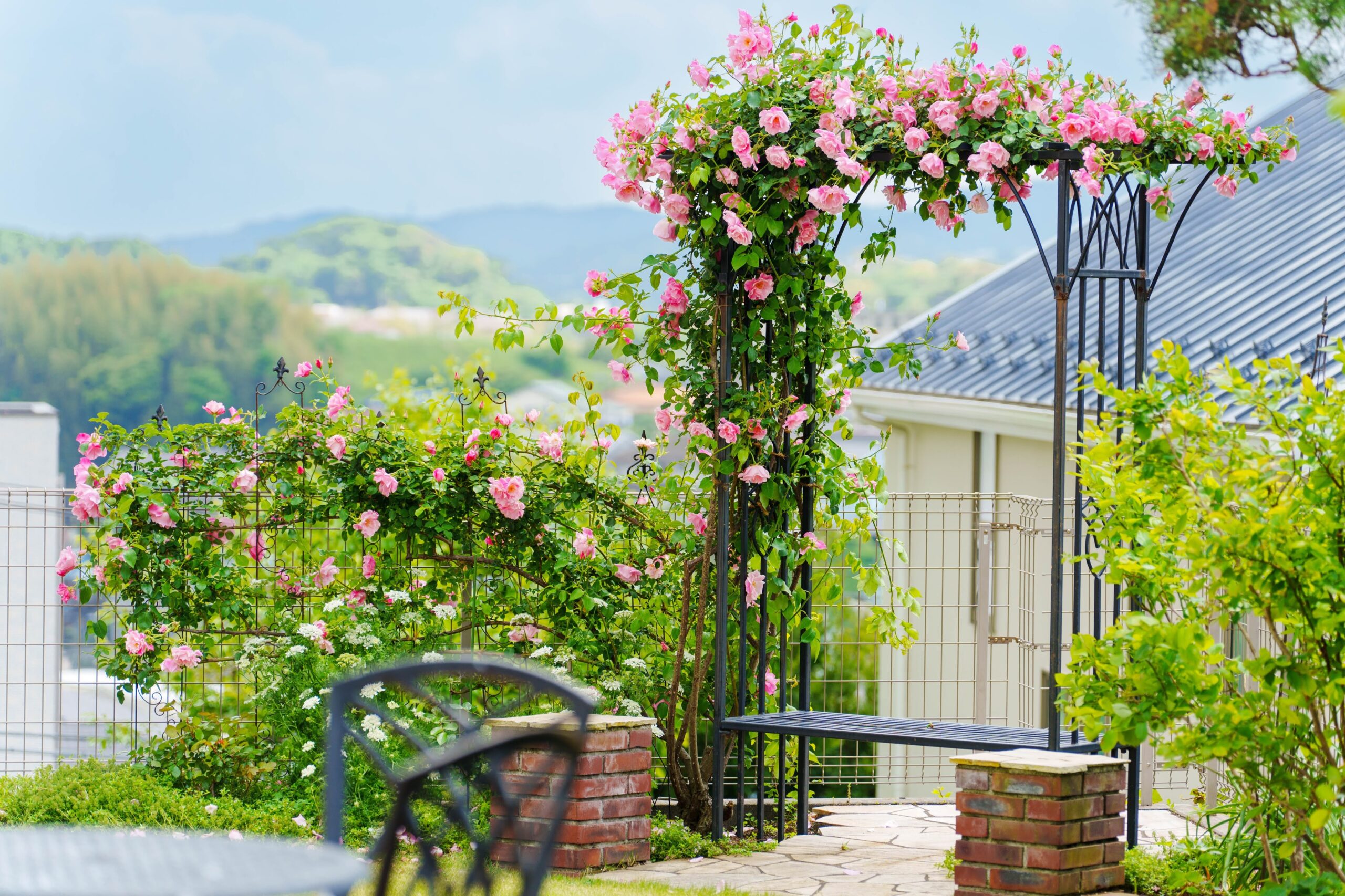 狭いスペースでも壁面やフェンスを活かして立体的に演出できるほか、トゲの少ない品種や減農薬・無農薬管理など、安全性にも配慮しています。