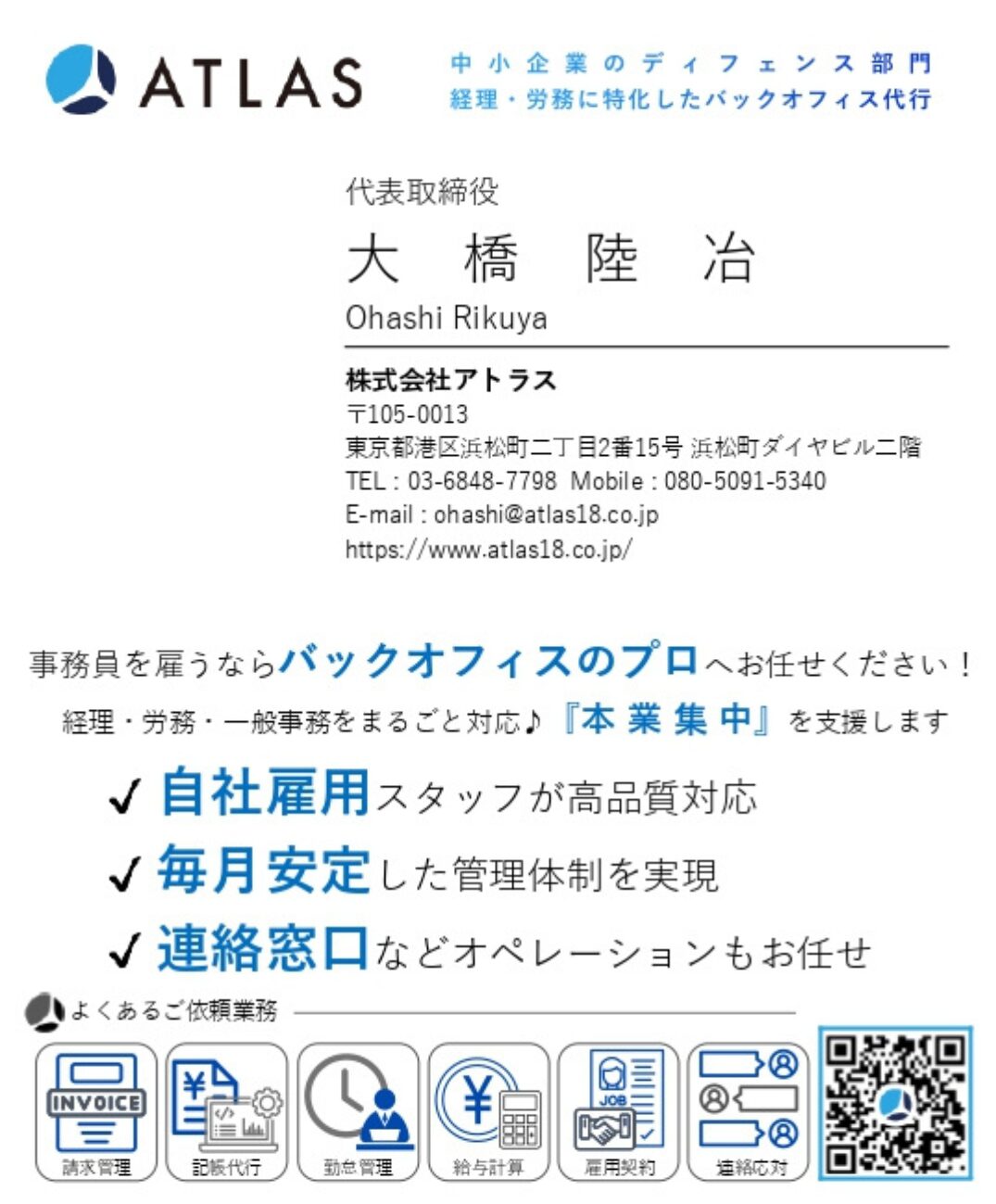 請求や支払い、社員の手続き、税金や社会保険…。本業に集中したいのに、こうした事務作業に追われていませんか?アトラスは、ただ作業を代行するだけではありません。社長の時間を取り戻しつつ、節税や社会保険料の見直しなど「お金が残る仕組みづくり」まで提案します。自社で事務員を雇うよりも、選りすぐりのスタッフたちで構成された経営管理チームに安心して任せられる感覚を体験してください。自由な時間とキャッシュを同時に増やし、事業成長に集中できる環境をご提供します。