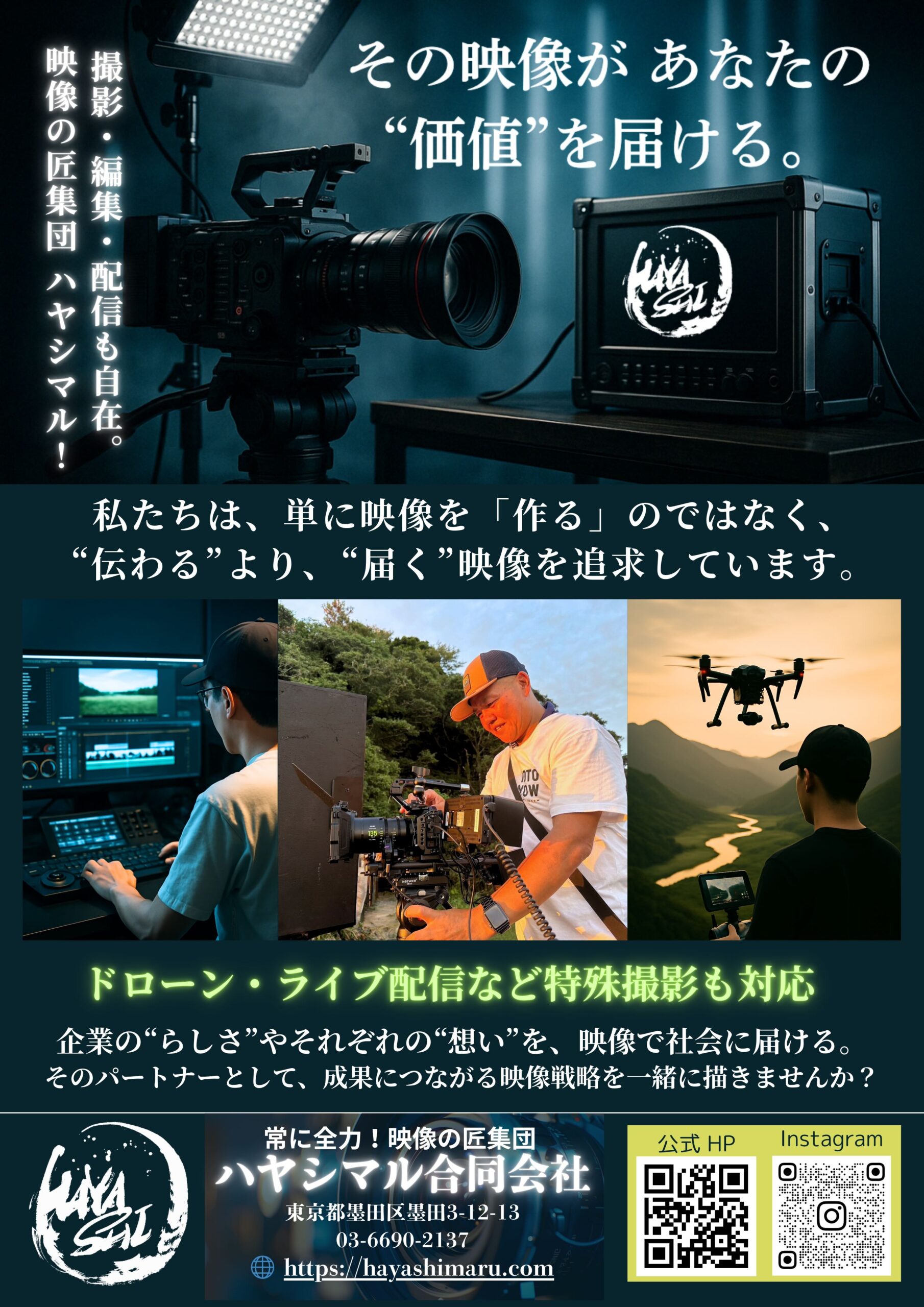ハヤシマル合同会社は、東京を拠点に活動する映像制作プロダクションです。