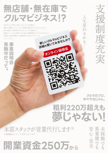 新車、中古車、リース、ローン、買取 タイヤが付いてればなんでもOK! 皆様の会社でクルマ事業始めてみませんか? FC店&紹介代理店大募集!