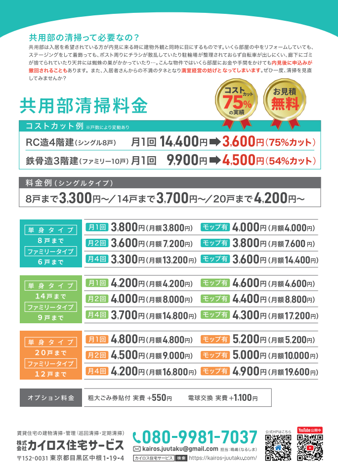 1戸あたり210円~の驚異のコスパ!1棟3,300円~承ります。巡回清掃だけではなくもちろん高圧洗浄やポリッシャーなどの定期清掃も実施可能です。清掃で他物件に差を付けましょう。