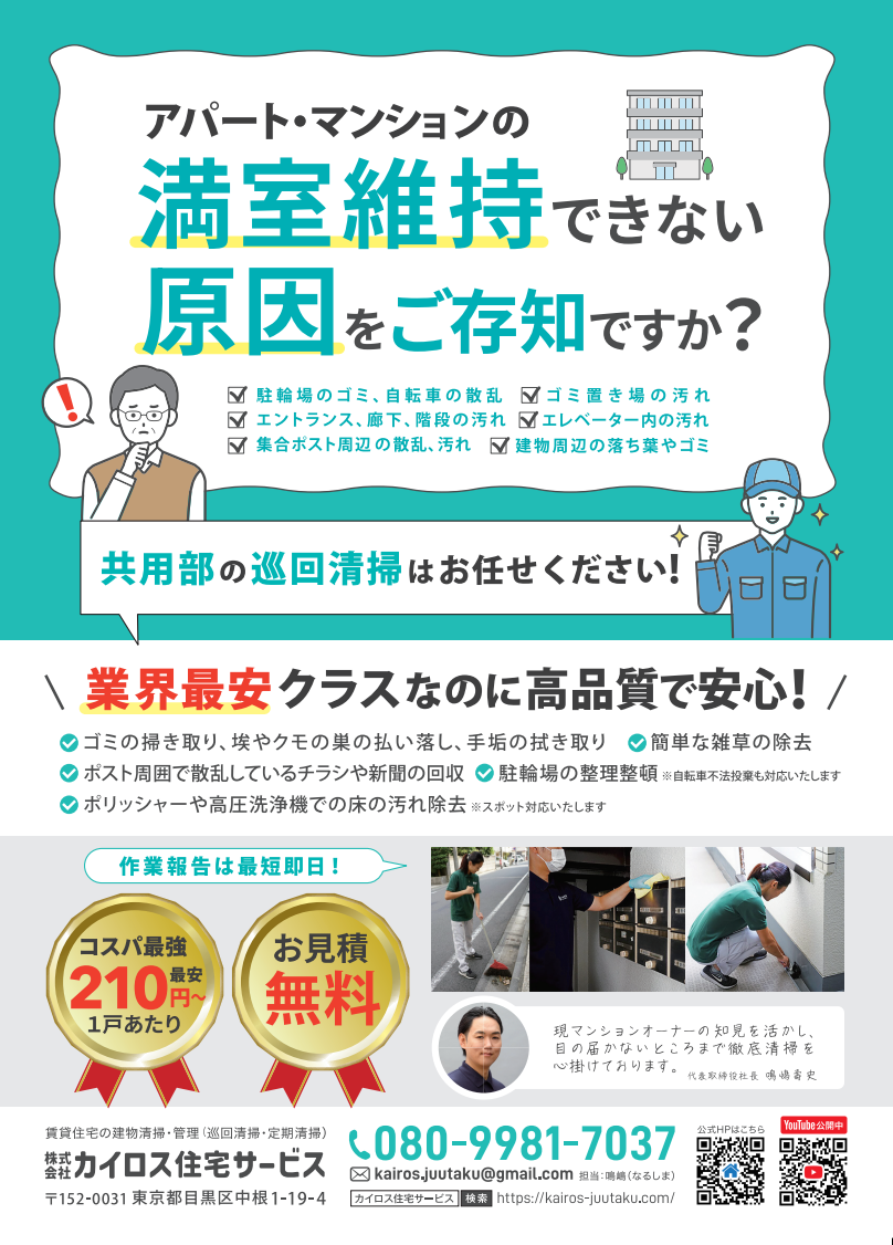 バイクで巡回するから業界最安値!代表が不動産オーナーなので安心して任せられます!東京都、神奈川県で展開中の巡回清掃専門の清掃会社