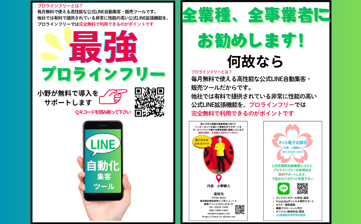 外注や広告費に数百~数千万かけられない個人事業者は、当たるコンセプトを自分で試行錯誤することが大切。プロラインフリーは、コンセプトが当たるまで無料でテストを繰り返し、当たった段階でグレードを上げられる仕組みがあります。創始者・加藤将太氏が6年間数億円をかけ徹底的に仕組化したノウハウを全て提供し、定期的な勉強会にも参加可能。ツールを使いながら学べる「数百万の価値があるビジネス塾付きLINEツール」で、コンセプトさえ見つかれば伝える仕組みは完璧です。私自身、数百万かけて経営者が学ぶ塾の裏側を見聞きしますが、その内容を上回ることも多く驚きです。車座では必ず写真のチラシを配り、ネットで集客・認知・教育・リピート・信頼の動線を作りたい事業者様に伝授。10万アカウントがアクティブですが、サポートできる認定講師は19人のみで、私は20人目に選ばれました。貴社のサービスに合った活用方法を丁寧に支援します。