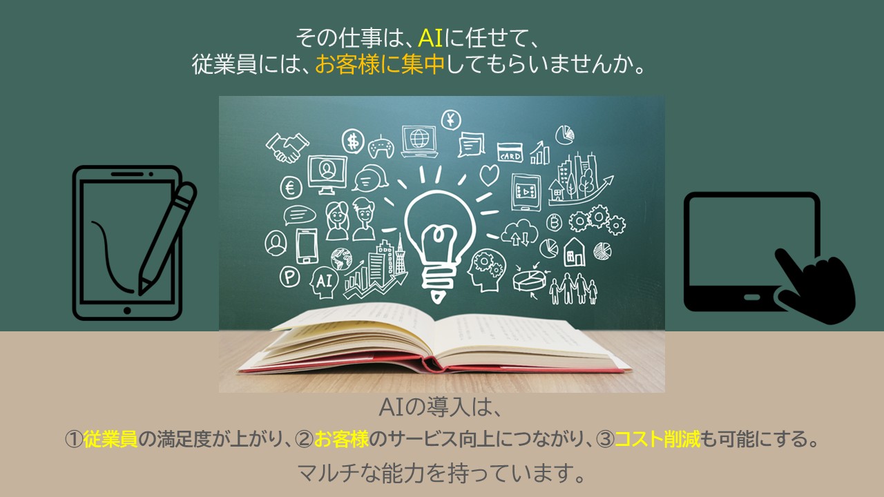 業務・仕事にAIを使う時代になってます。難しいコト、カンタンなコト、いろいろな業務でAIを使えます。AIを業務に取り入れるコトで新しいことが見えて決ます。お客様へ、従業員へ、お取引先への印象も上がり、知らない間にブランディングにも貢献します。